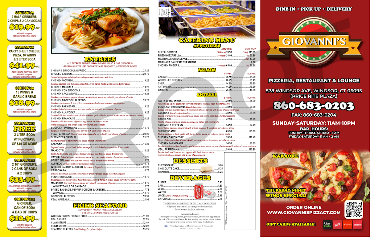 Welcome to Giovanni's Pizza Restaurant Bar & Lounge, nestled in the heart of Windsor, CT. This inviting restaurant combines delicious food with a vibrant atmosphere, perfect for casual dining or a night out. The menu showcases a fantastic array of dishes, including Italian pizzas, sumptuous salads, and hearty grinders. Customers rave about the freshness of ingredients, particularly in their Mediterranean and Caesar salads.